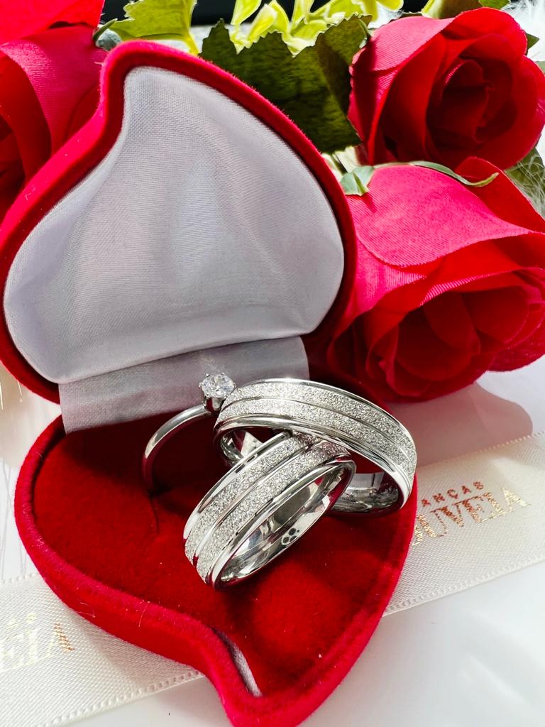 Par de Alianças Aço Inox Prata Reta 4MM Jateada e Tradicional