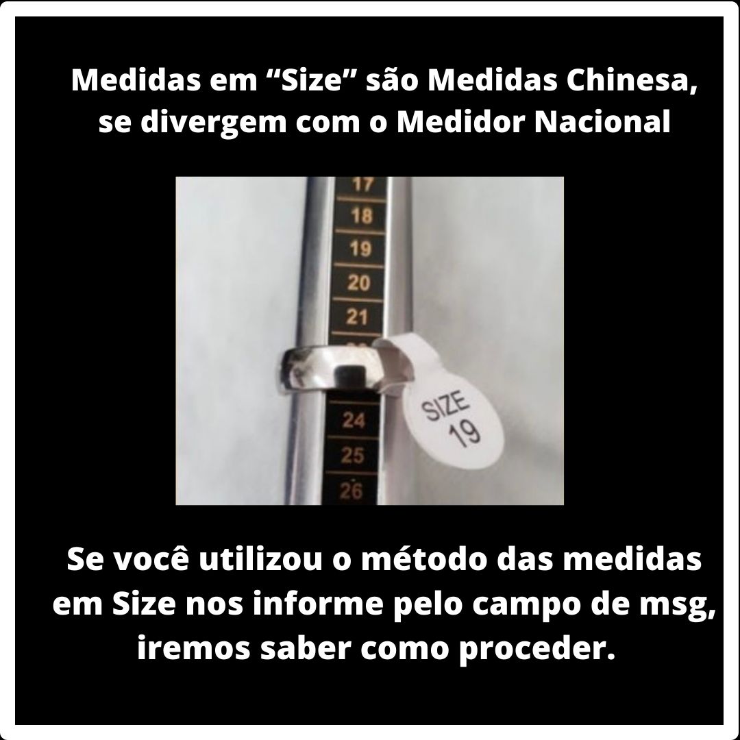 Caso tenha alguma dúvida, a melhor forma de medir é em uma joalheria ou até mesmo naquelas lojas de bijuteria que vendem anéis com um papelzinho branco escrito ‘size’ é a forma mais correta de confirmar as medidas.