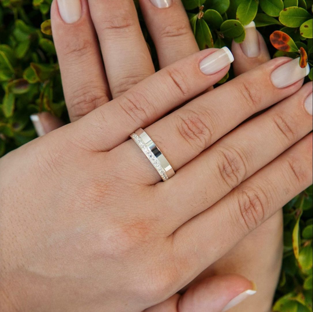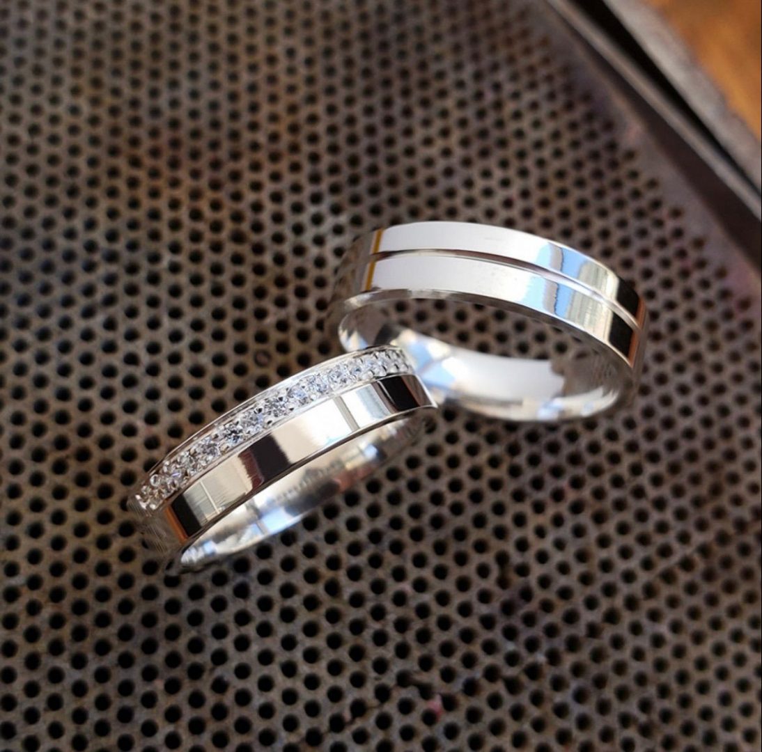 Par de Alianças de Prata 950 – Reta Friso no Canto e Pedras Cravejadas pela Metade