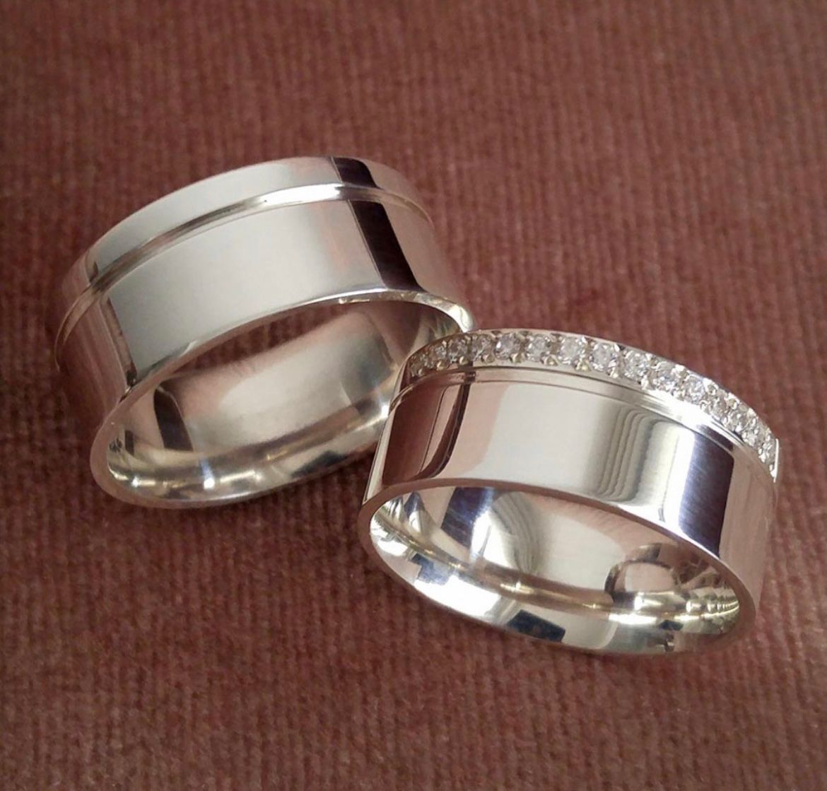 Par de Alianças de Prata 950 – Reta Friso no Canto e Pedras Cravejadas pela Metade