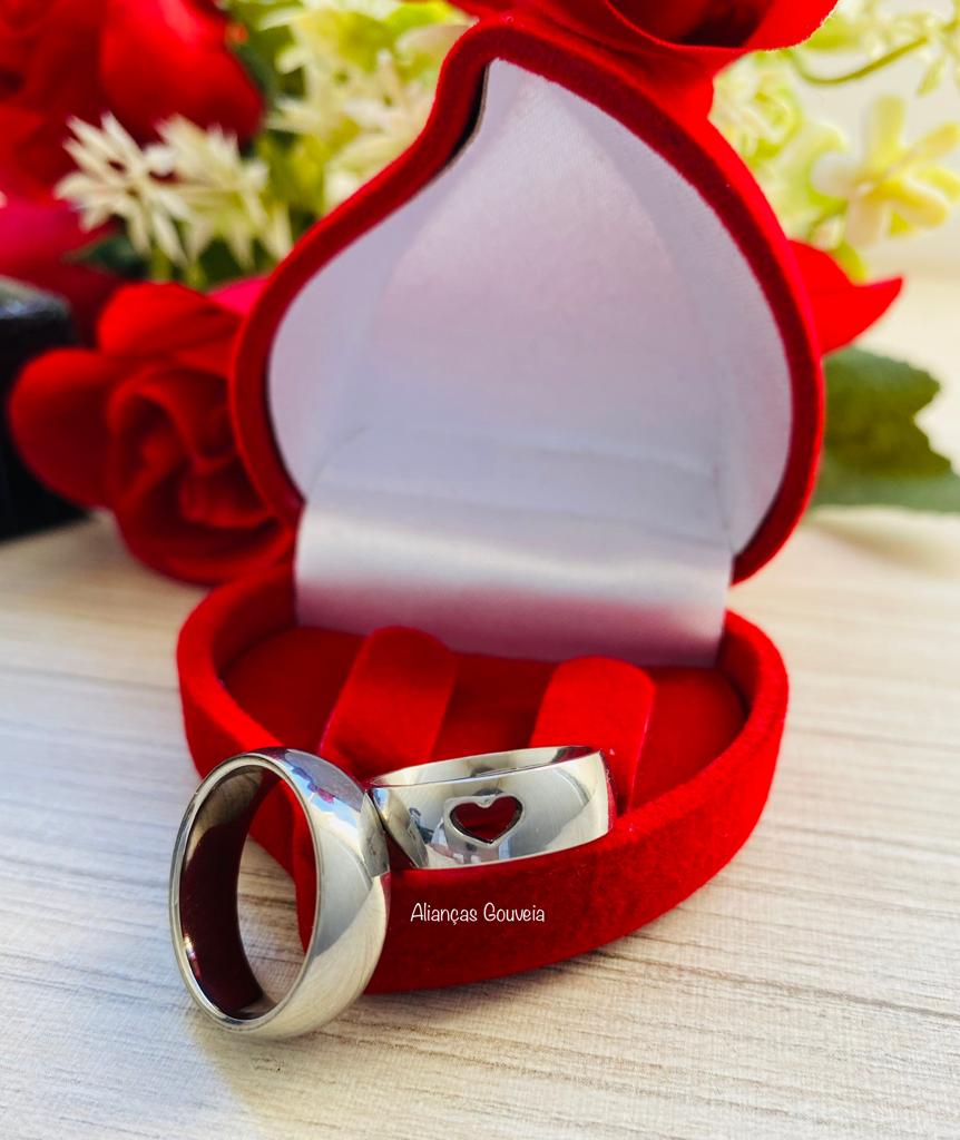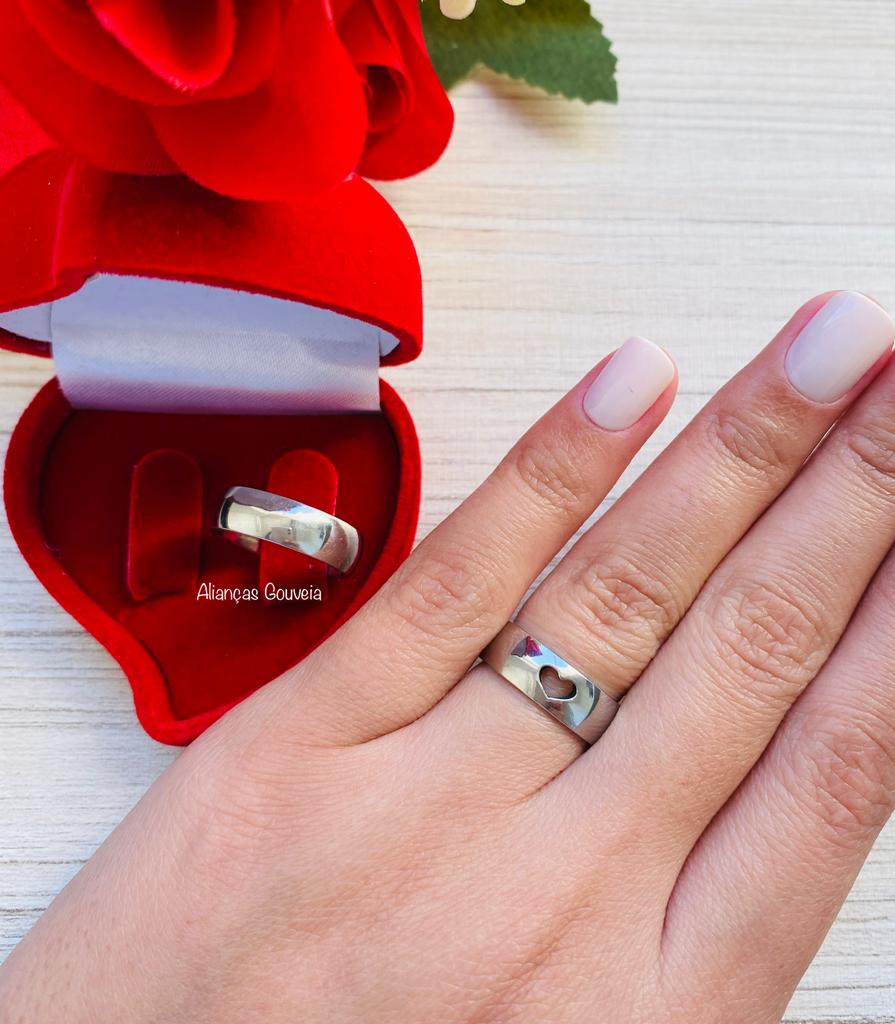 Esse é um lindo Par de Alianças de Aço Inoxidável Coração Vazado com 6MM de largura