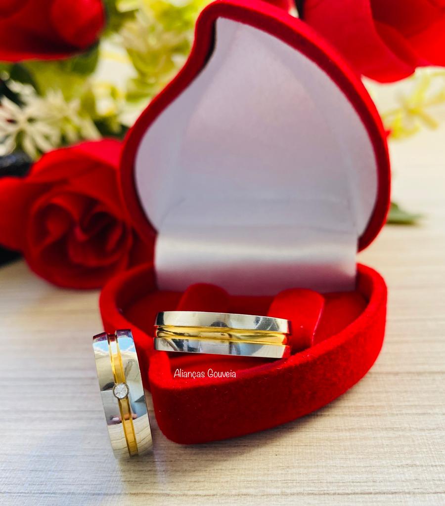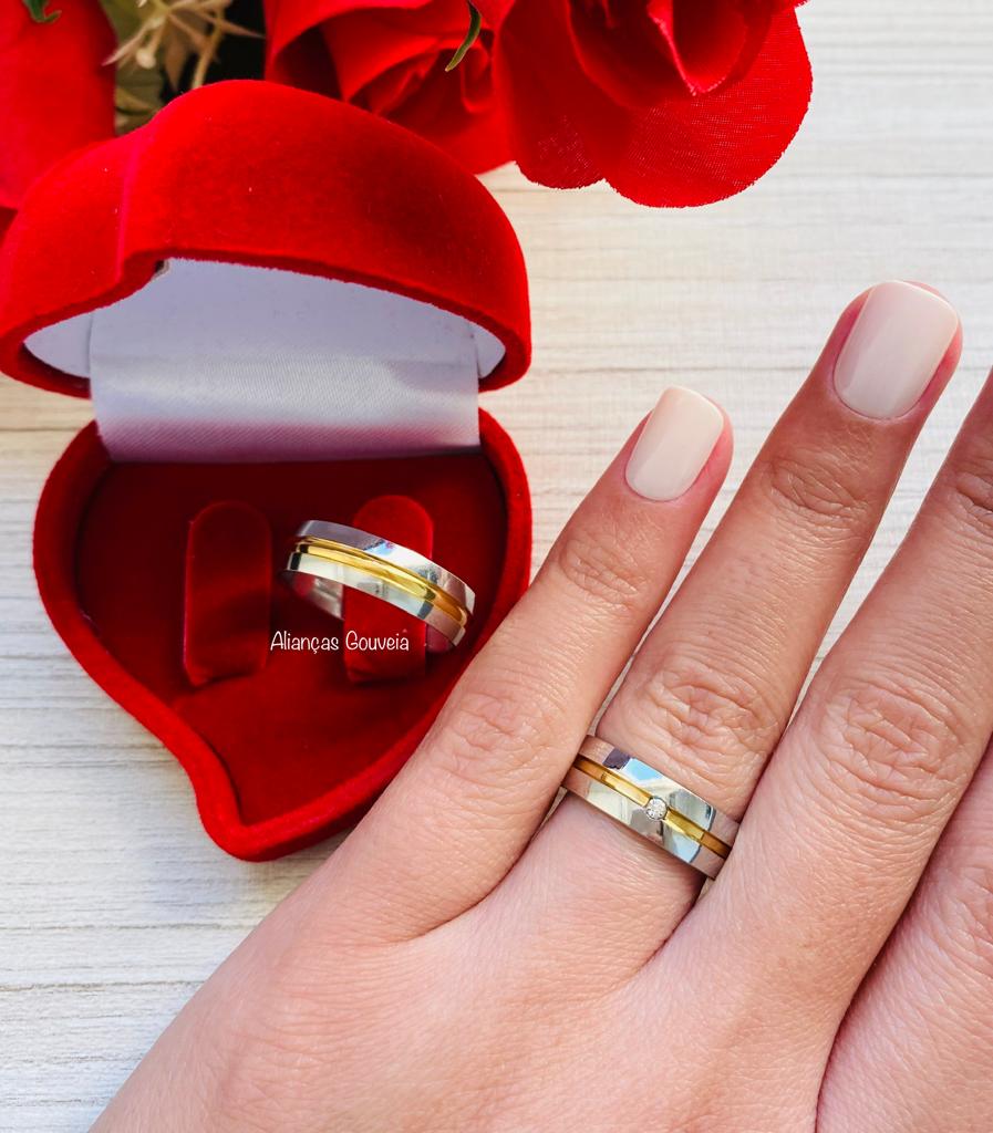 Par Alianças Reta com Filete Dourado + pedra com 6MM de Largura