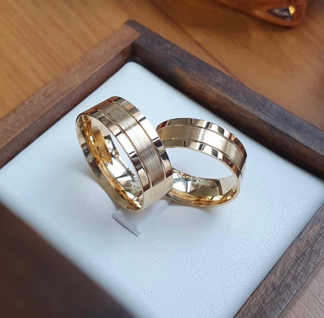 Par de Alianças de Moedas Antiga Reta dois Frisos Aberto Escovado Meio