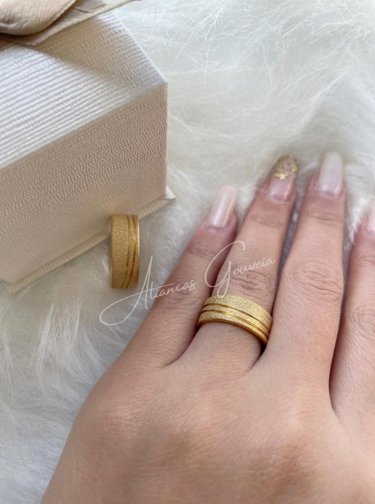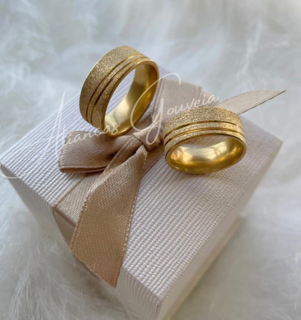 Esse é um lindo Par de Alianças de Aço Inoxidável Dourada Reta e Dois Frisos Diagonal Jateada  com 7MM de largura.