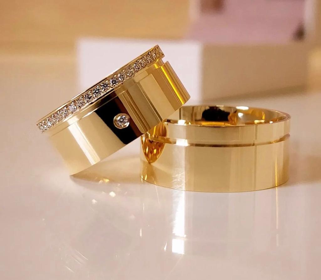 Par de Alianças de Moedas Antiga Reta Friso no Canto com Pedras Zirconia Cravejada