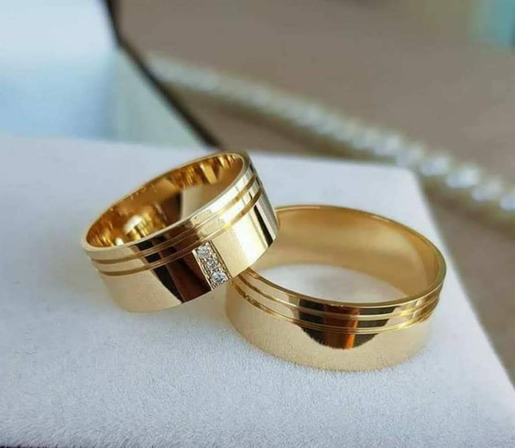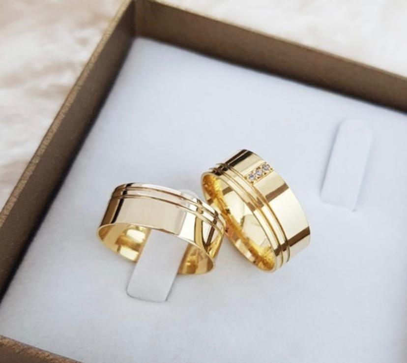 Par de Alianças de Moedas Antiga Reta e dois Frisos e Pedras